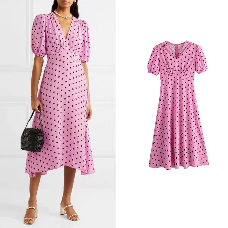 Images of Vintage za 2019 stain women dress dot a-line high waist pink vestidos midi dress back zipper ropa mujer chic puff sleeve vestido :