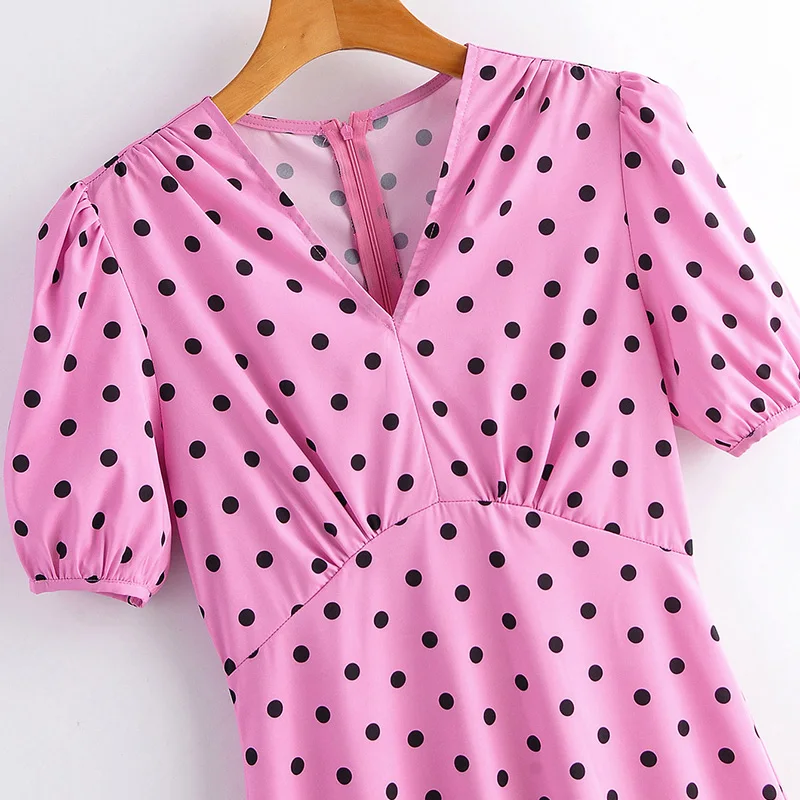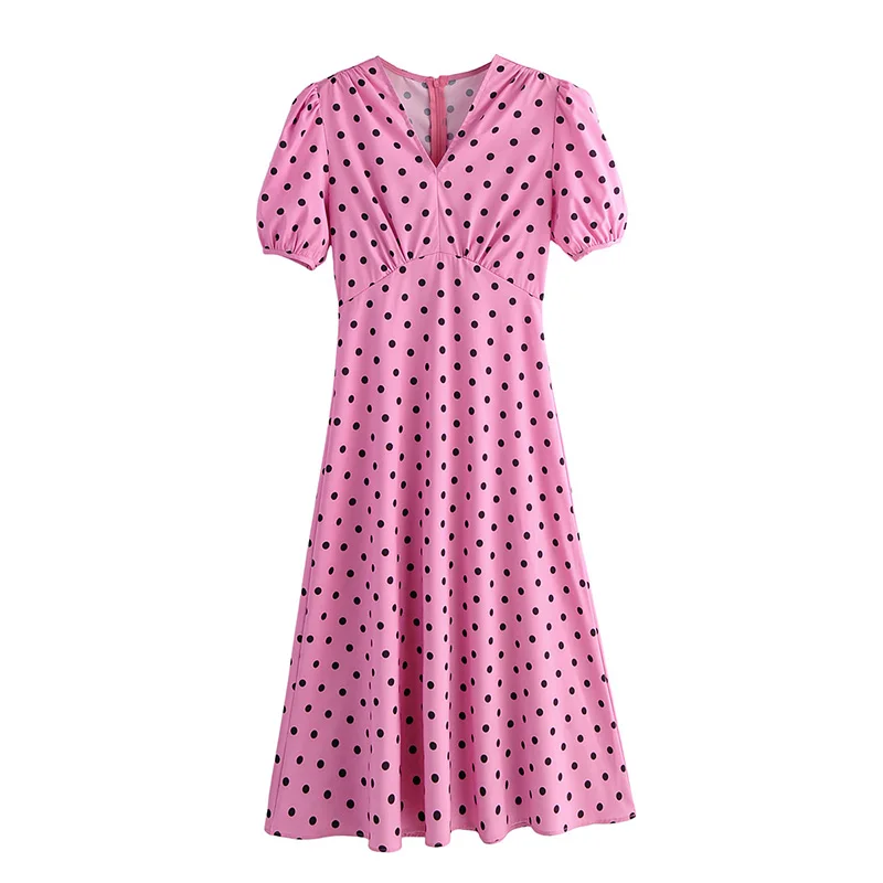 Sale Vintage za 2019 stain women dress dot a-line high waist pink vestidos midi dress back zipper ropa mujer chic puff sleeve vestido
