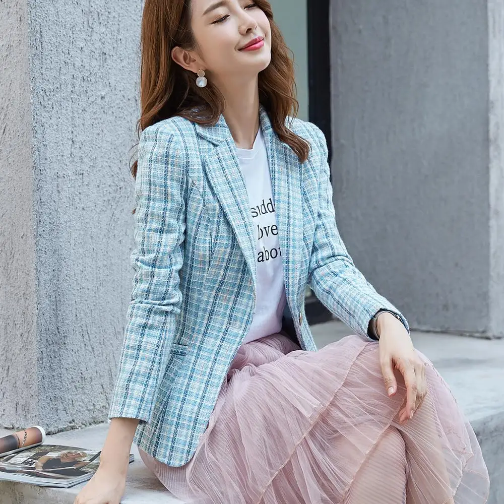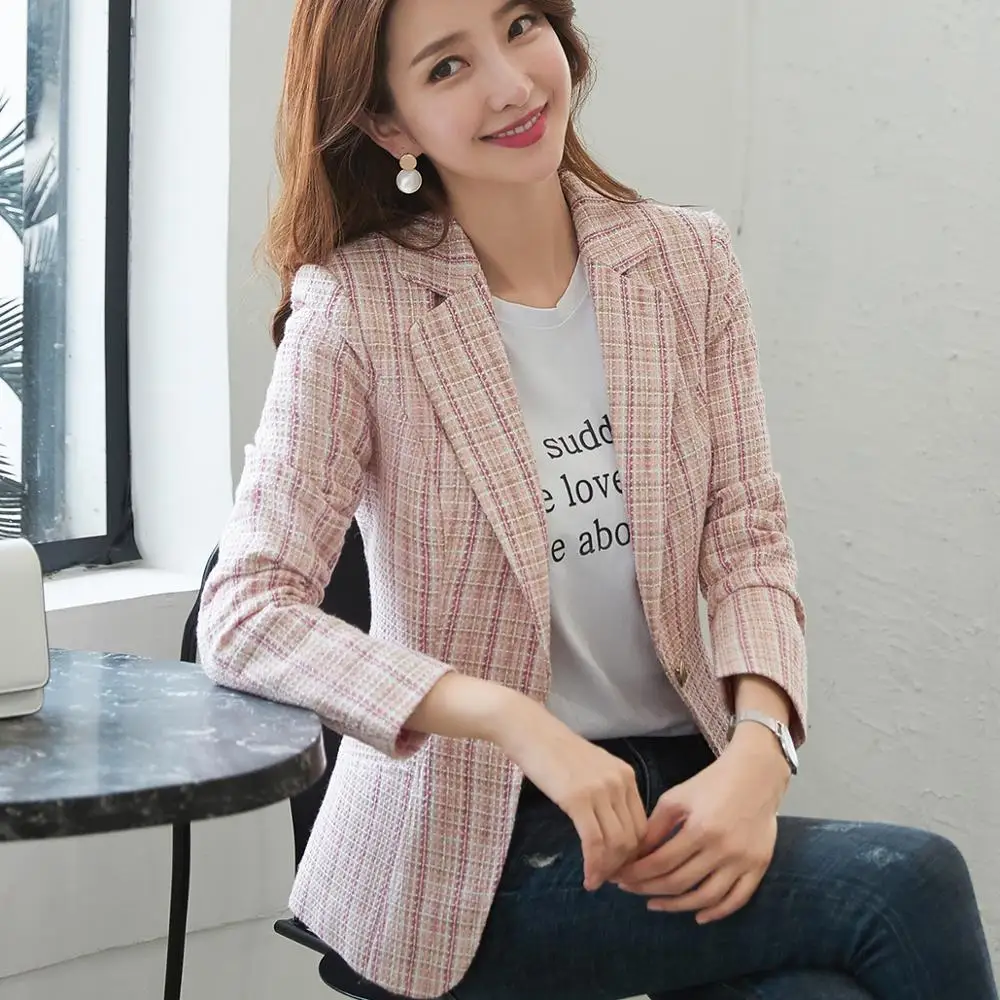 Buy Female Elegant Formal Casual Women Blue Pink Apricot Plaid Blazer Long Sleeve Slim Blazer New Dress Outwear Jackets and Coats