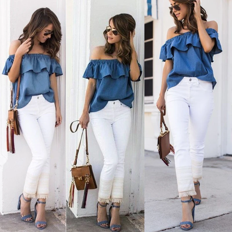 New Womens Vintage Off Shoulder Denim Solid Blue Costume Ruffle Summer Slash Neck Casual Loose Top Blouse