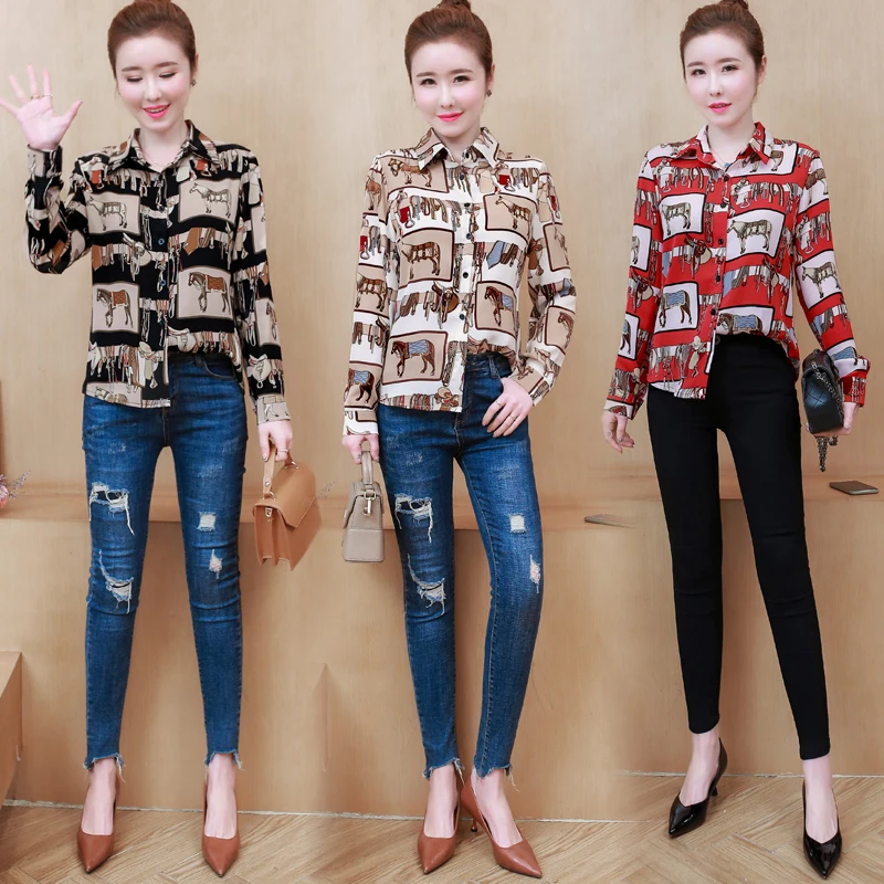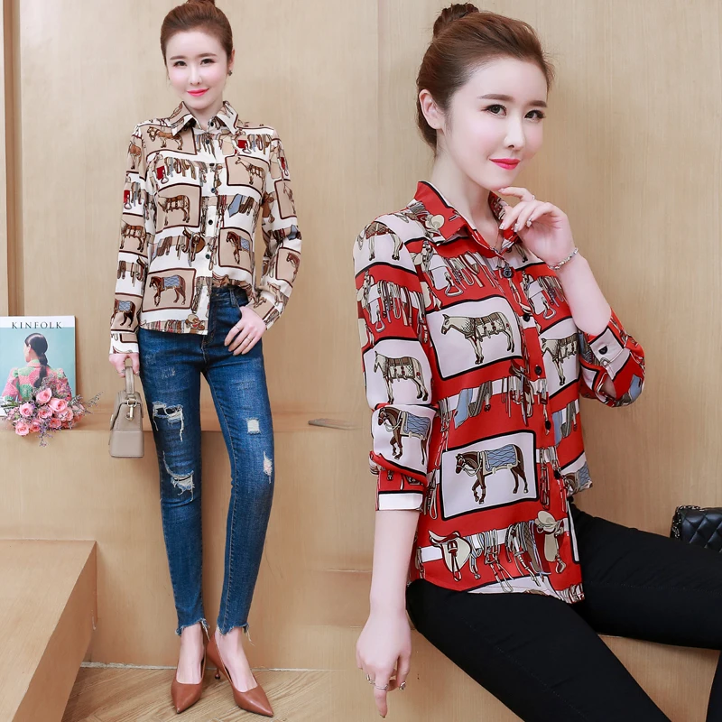Promo Horse Pattern Ladies Tops Long Sleeve Vintage Turn-down Collar Loose Print Blouse Women Casual Apricot Red Black Shirt Female