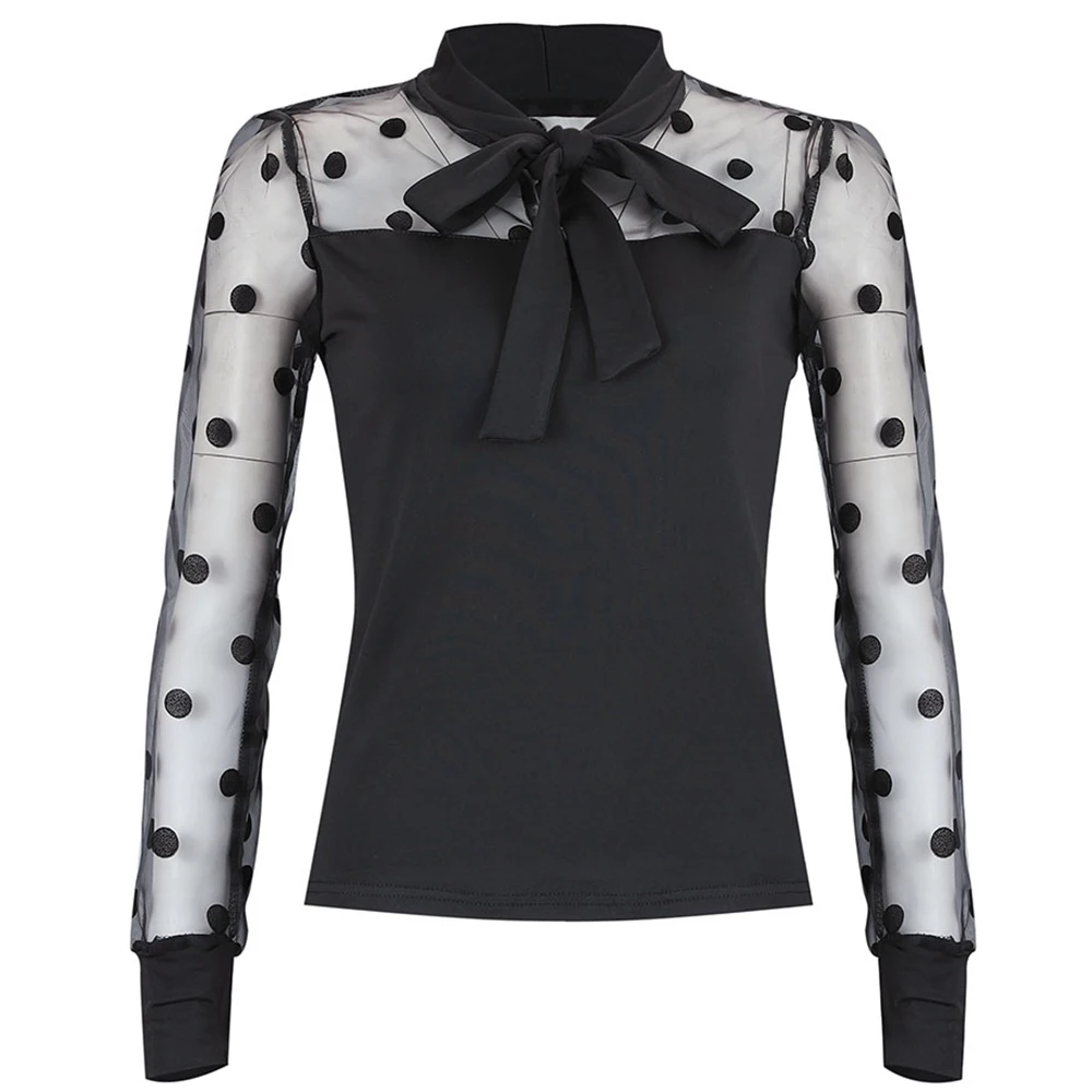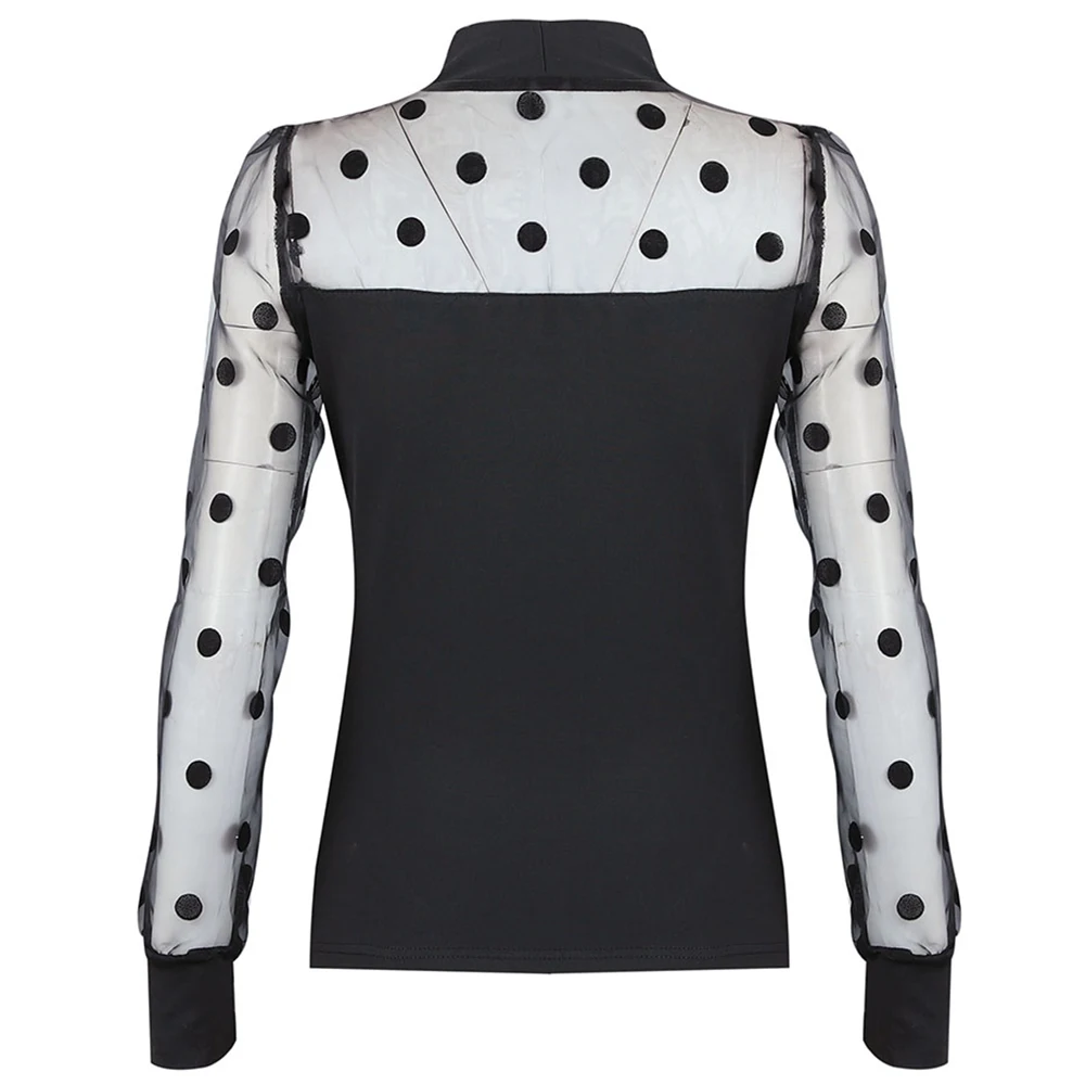 New Polka Dot Puff Sleeve Women Tops And Blouses Mesh Patchwork Ladies Shirts Streetwear Vintage Bowknot Blouse Female Blusa D35