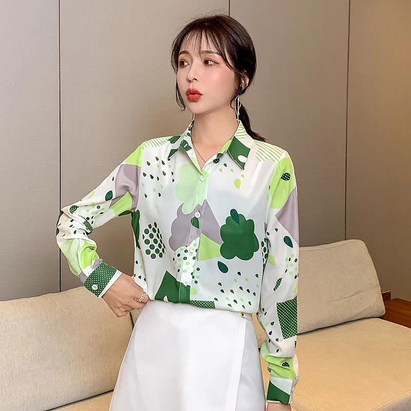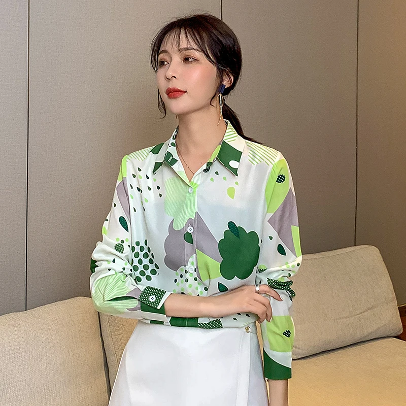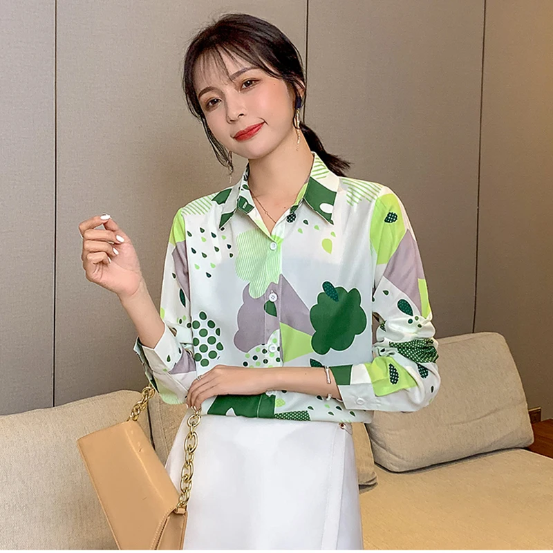 Promo Fresh Green Chiffon Blouse Women Long Sleeve Spring Casual Shirts Female Fashion Print Ladies Top Elegant Temperament Tunic Girl