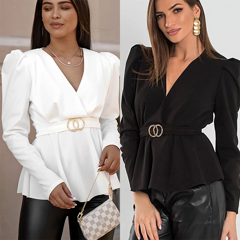 Images of Fashion Sexy Low Cut Solid Color Ruffled Long Sleeve Women Blouse Sexy Tops and Shirt Women Long Sleeve Office Wear :