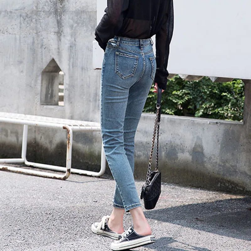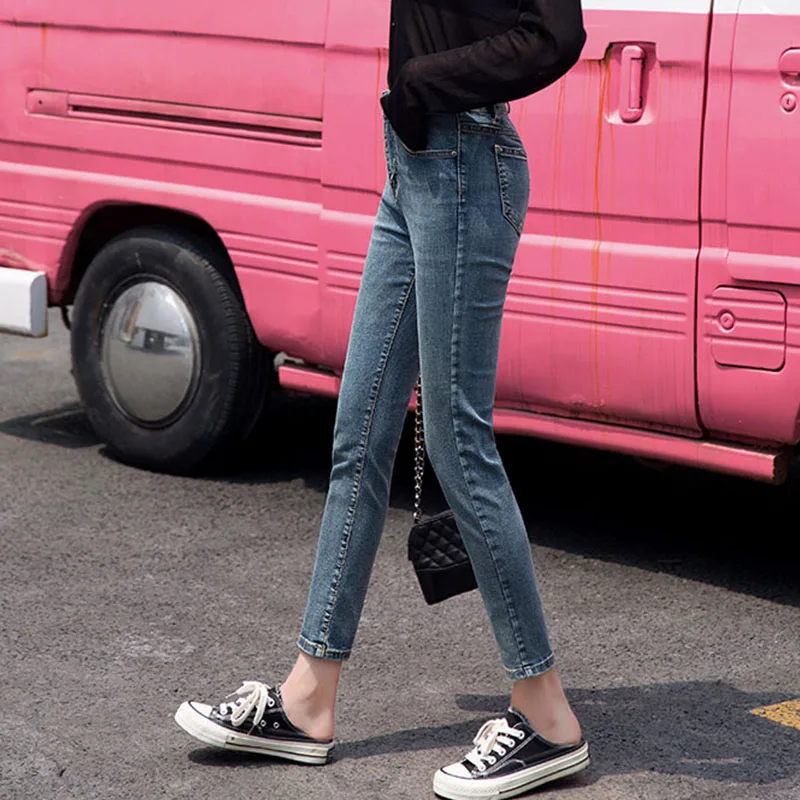Best Offer 2020 New girl Pants High Quality Slim Pants Buttons Zip Ankle Pants High Waist Daily Fashion Black Blue Gray Tight woman pants