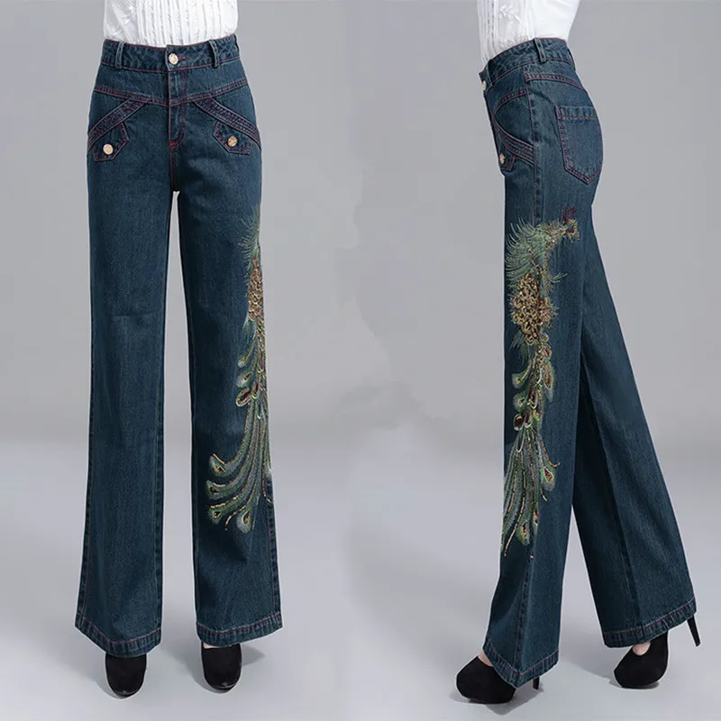 Sale Free Shipping 2015 New Fashion Autumn And Winter Thick Plus Size XXL Loose Wide Leg Pants Straight Jeans Trousers Embroidery