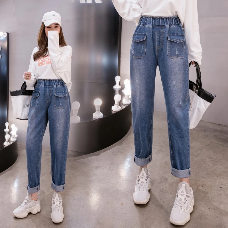 Images of Plus Size S-5XL Jeans Women 2020 New Denim Pants Fashion High Waist Jeans Female Pants Harem Pants Trousers Blue :