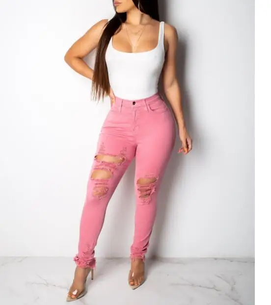 Images of 2020 Women Neon Color High Waisted Ripped Jeans Femme Skinny Pencil Pants Sexy Hole Streetwear Denim Jeans Slim Stretch Jean Tro :
