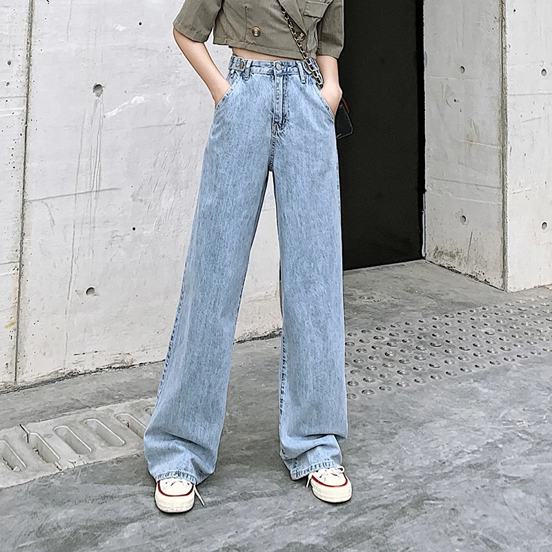New Fashion Jeans Woman Waist Slim Mom Jeans Woman Plus Size Cylinder High Waist Wide Leg Loose Jeans Mop Design Jeans blue Retro