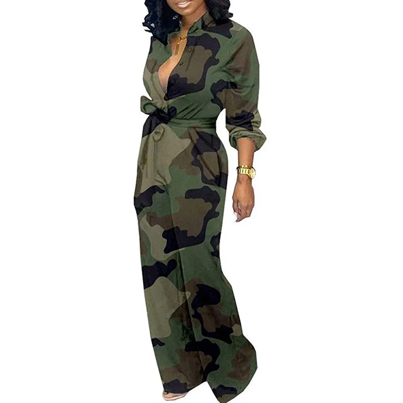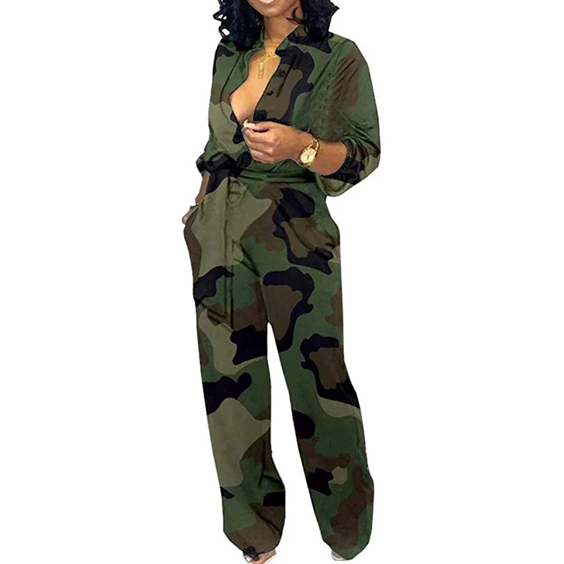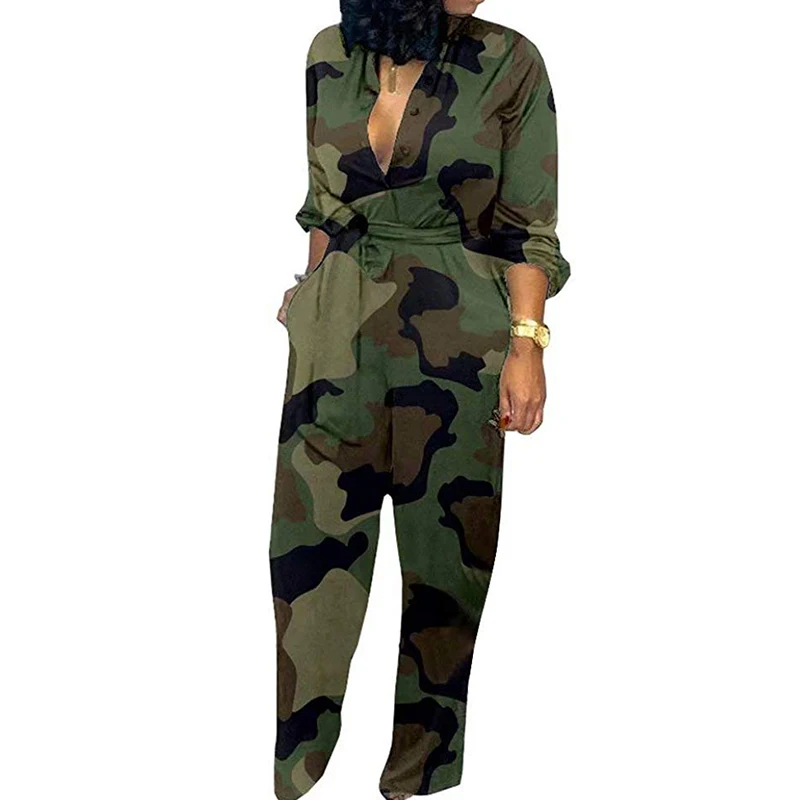 Best Offer Sexy Jumpsuit Women Deep V Neck High Waist Long Sleeve Camouflage Print Wide Leg Long Pants Jumpsuit Rompers with Pockets