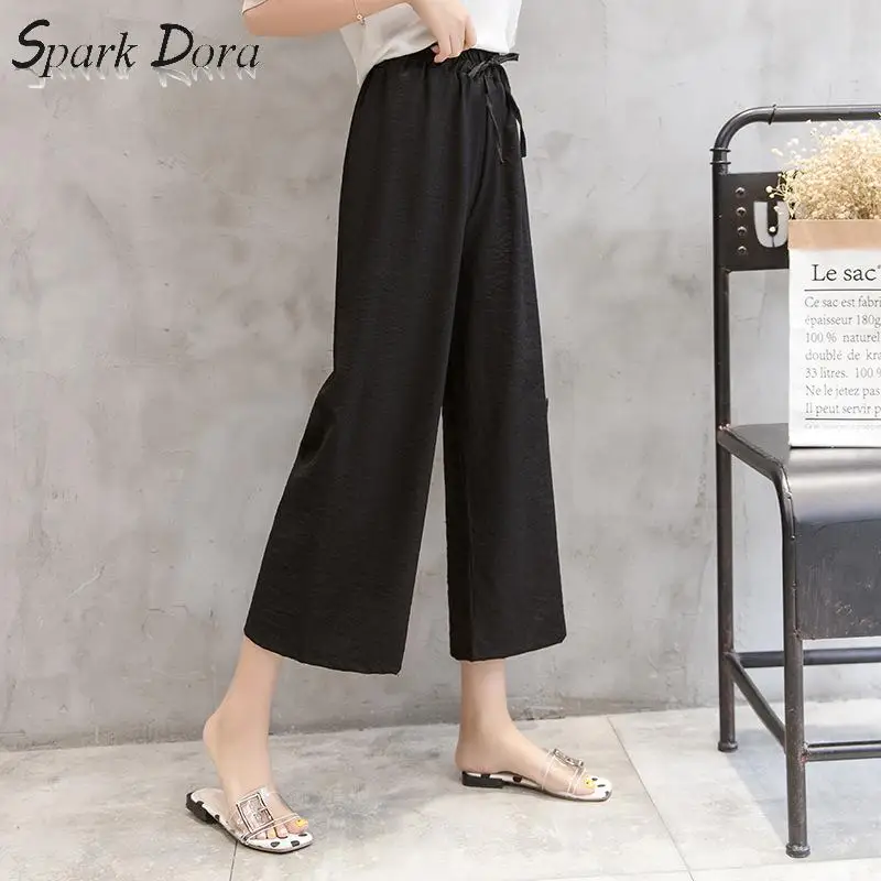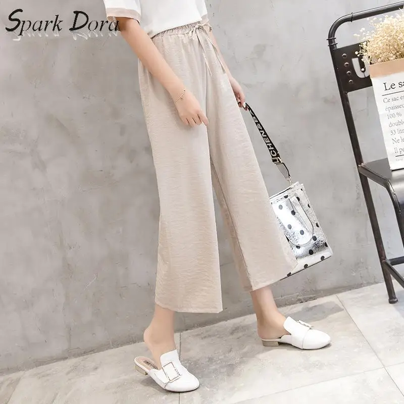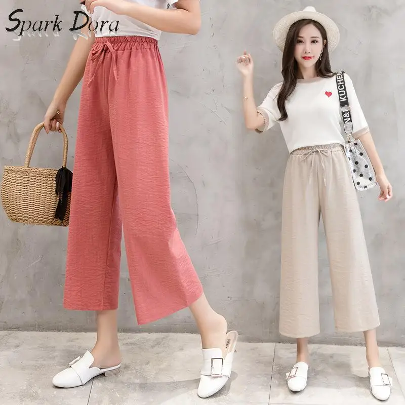 Images of SparkDora Cotton Hemp Wide Leg Pants Summer Loose All-around Elastic Waist Korean Version High Waist Nine Point Casual Pants :