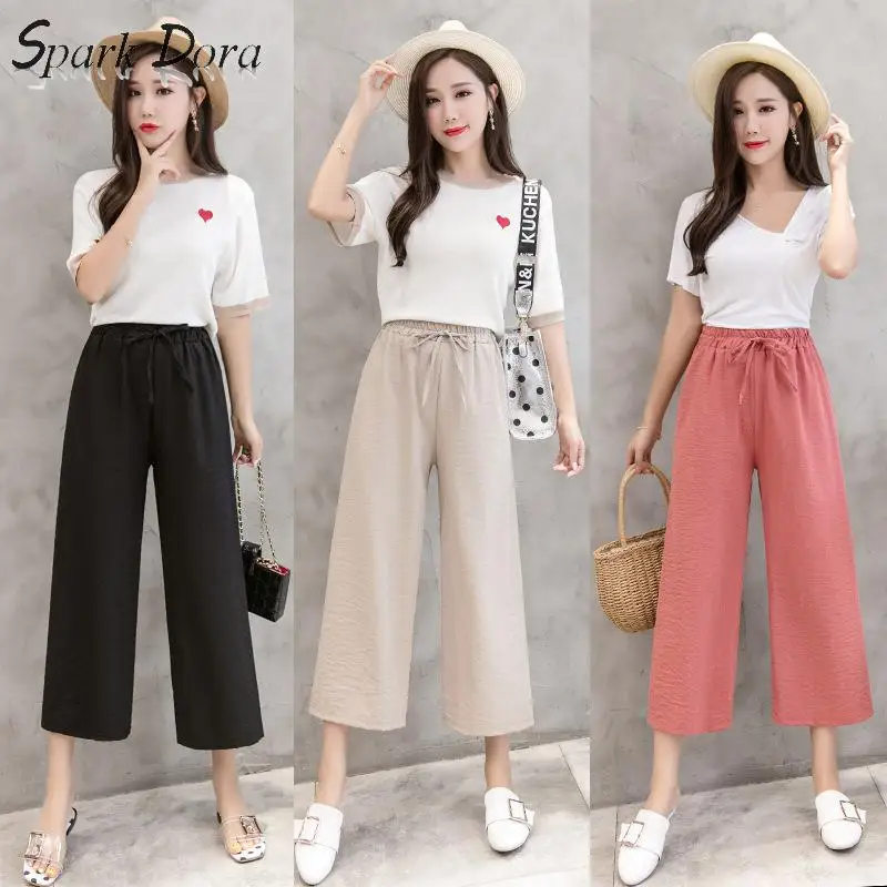 Buy SparkDora Cotton Hemp Wide Leg Pants Summer Loose All-around Elastic Waist Korean Version High Waist Nine Point Casual Pants